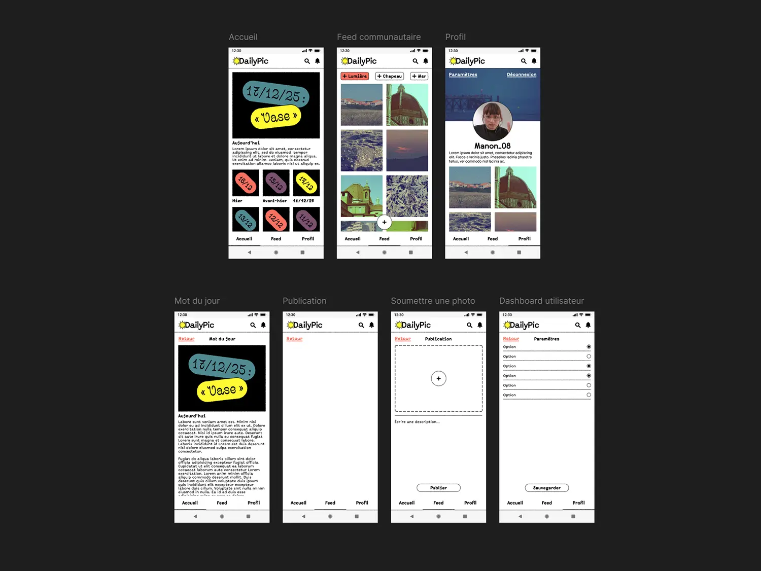 Conception et maquettage de l'application mobile d'un réseau social fictif. «DailyPic» propose un thème quotidien auquel les utilisateurs peuvent répondre avec leur photographie du jour.