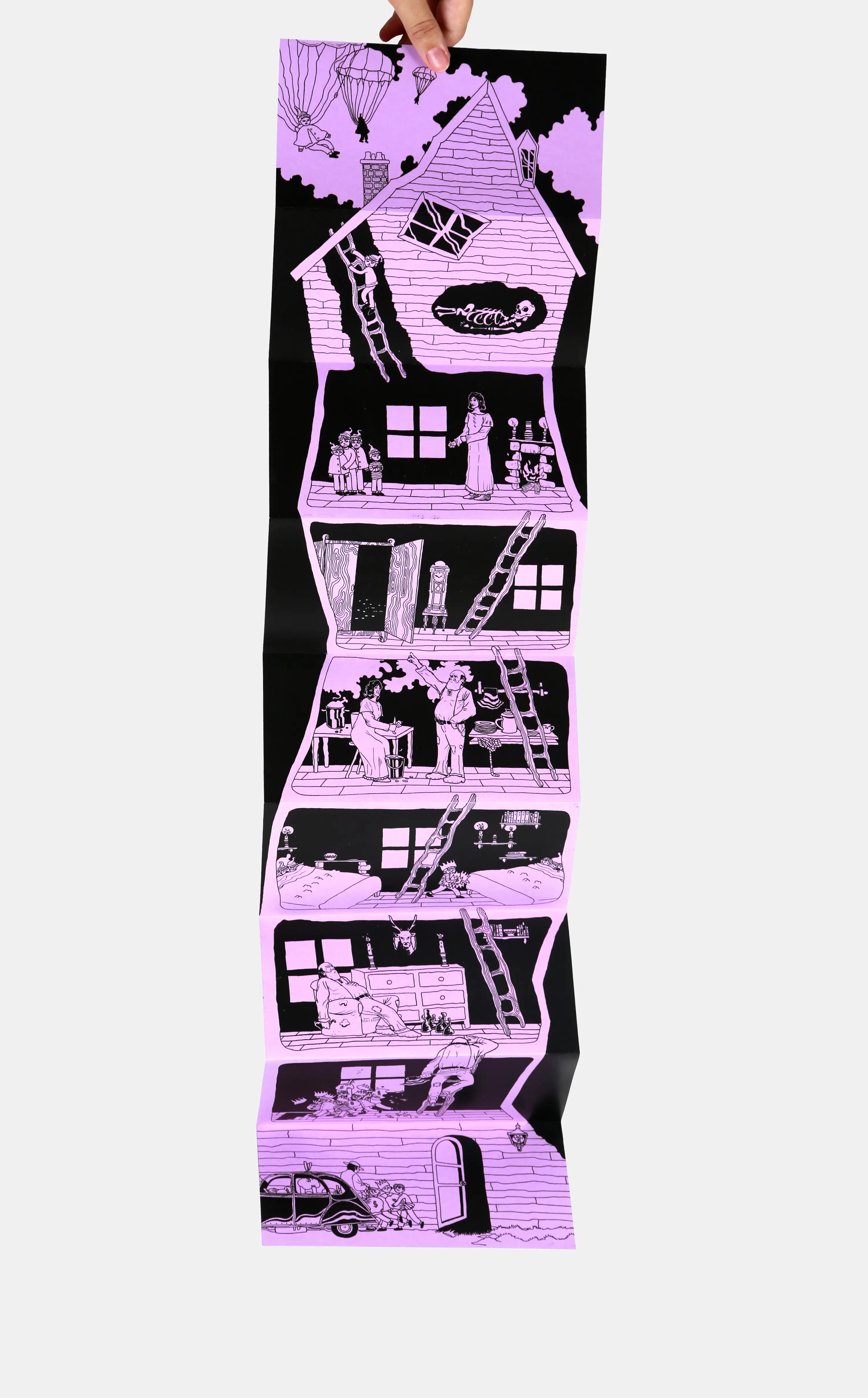 Projet inspiré de la collection Façade des éditions Polystyrène. Découpe d’un bâtiment dans lequel évoluent les personnages d’un conte au choix.