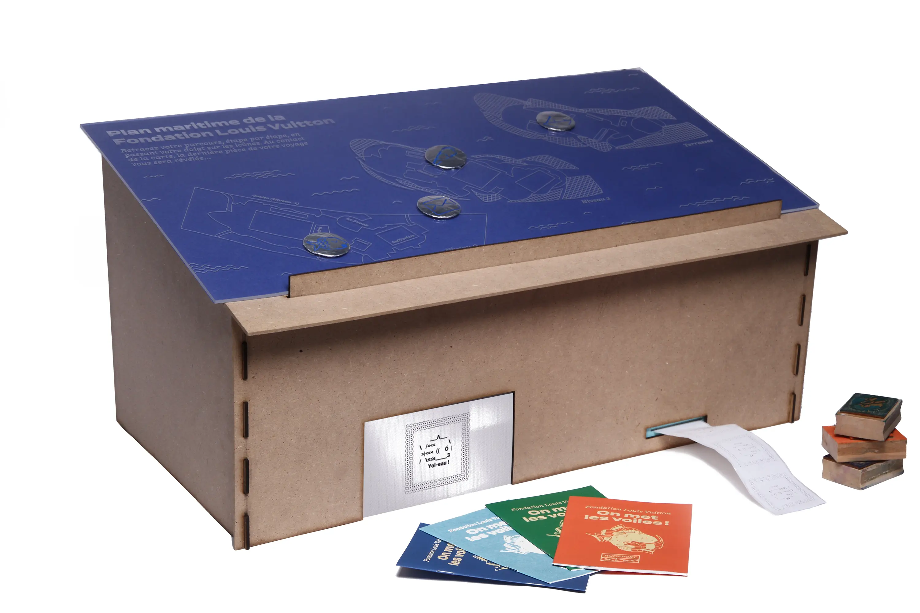 À l'arrivée, le visiteur se voit confier un passeport qui accompagnera et guidera sa déambulation, et qu'il fera tamponner à chaque étape complétée. Une fois tous les tampons récoltés, la carte interactive permet de retracer le parcours effectué en touchant les boutons associés dans l'ordre. Ainsi, un timbre représentant un poisson est généré en temps réel en fonction des boutons pressés, à l'aide de la technologie Arduino, puis imprimé et collé au dos du passeport pour signifier la finalisation de l'aventure.