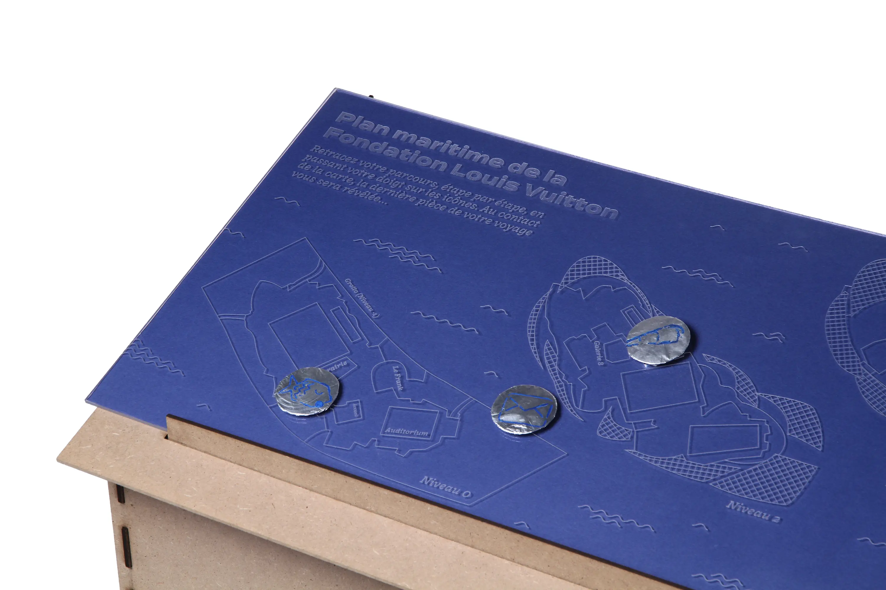 Imagination d'un dispositif de médiation culturelle pour la période inter-exposition de la Fondation Louis Vuitton. Première et dernière étape d'une balade modulaire et ludique au sein du bâtiment.
