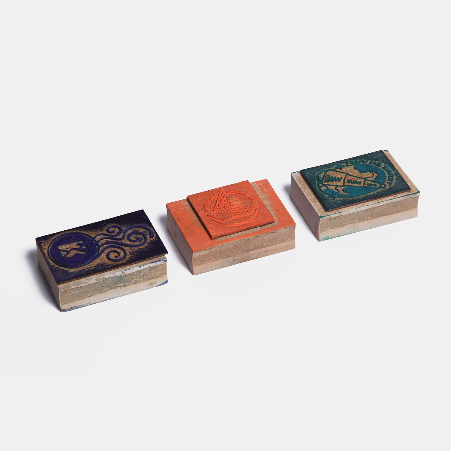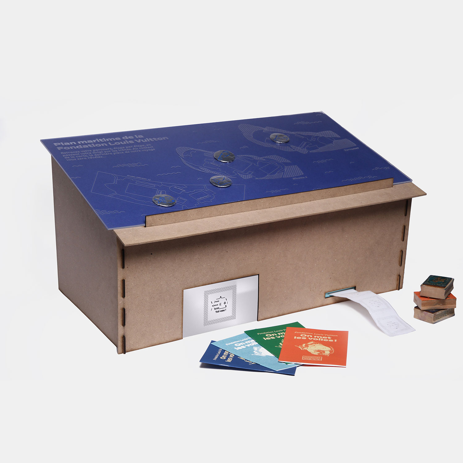 Plaque de plexiglas transparente gravée et percée à la découpeuse laser, posée sur une feuille de papier bleu. Boutons en carton emballés dans de l'aluminium peint et soudés à des fils, liés à une carte Arduino. Structure en MDF séparée en quatre pièces emboîtables à la découpeuse laser. Passeports A6 de six pages agrafées. Tampons en MDF gravés à la découpeuse laser.