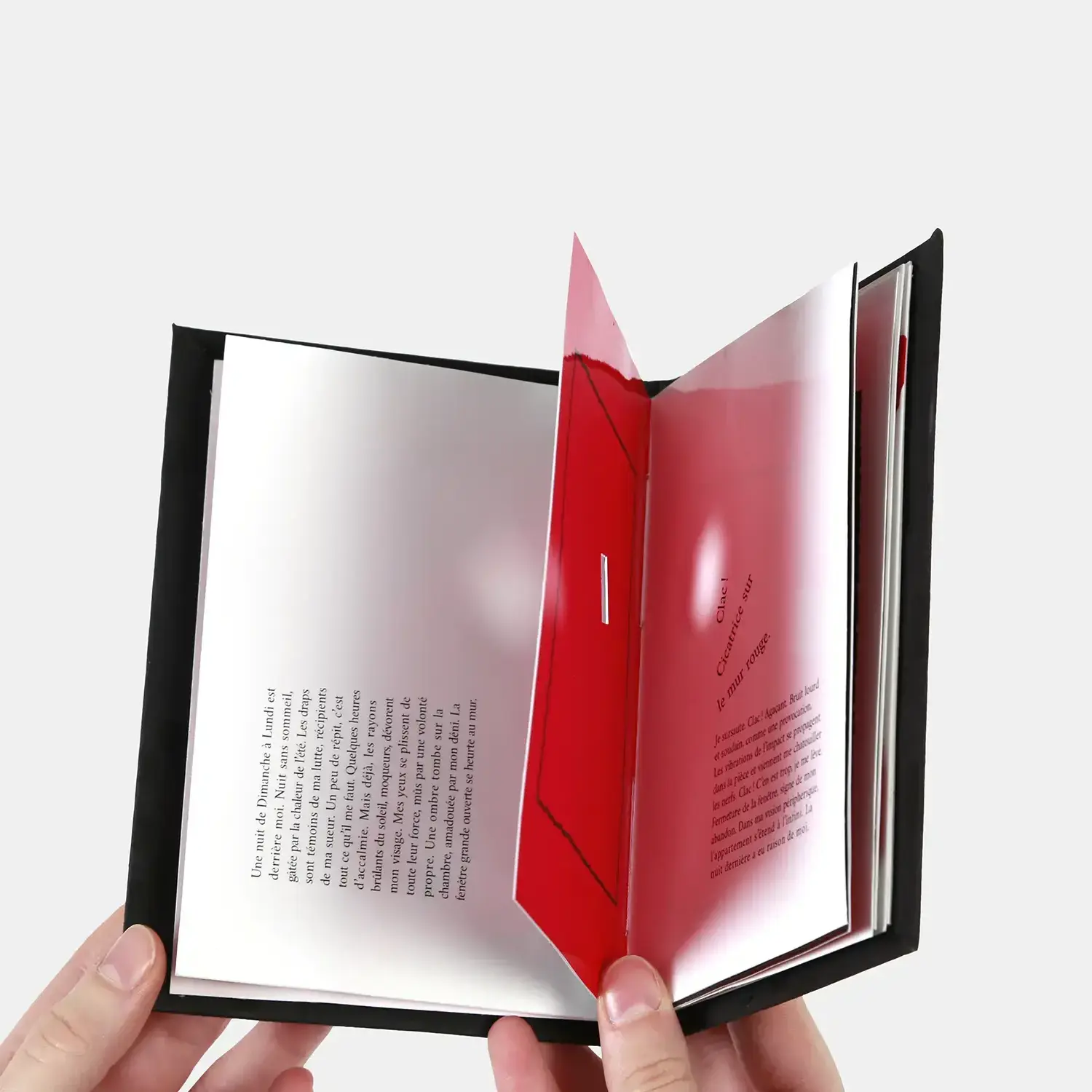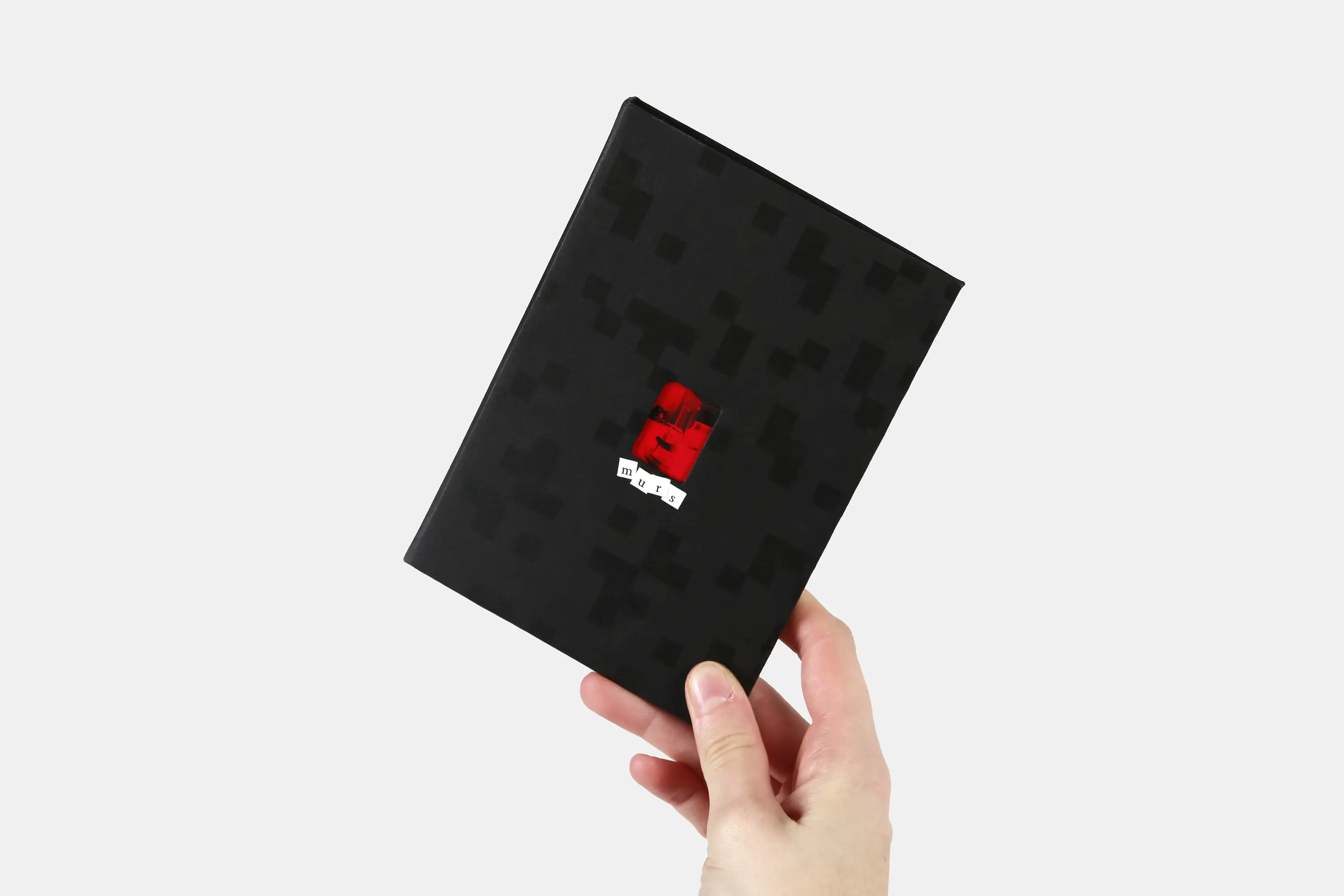 Carnet A6 de vingt pages reliées à la main. Impression sur papier photo. Couverture cartonnée recouverte de papier noir imprimé. Photographie encastrée dans la couverture. Titre composé de vignettes miniatures de papier découpé.